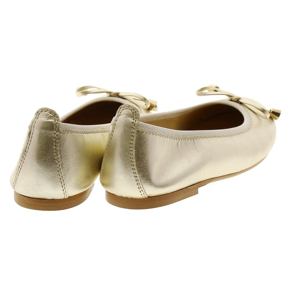 Bailarina con elástico para una mayor sujeción del pie sin dejar marcas ni hacer rozaduras. Fabricadas en piel con suela de crepelina en color caramelo. Llevan un lazo de piel sobre la pala con terminales en níquel.