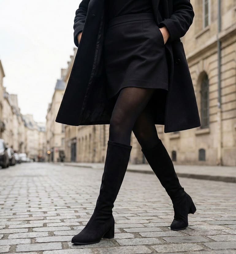 El enemigo número uno de las chicas petite es el corte visual horizontal. Para evitarlo, intenta que tus botas sean del mismo color que tu pantalón o tus medias. Por ejemplo, unas botas negras con medias tupidas negras crean una línea infinita desde la cadera hasta la punta del pie.