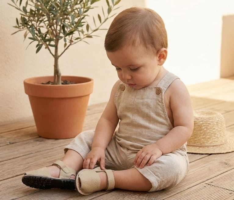 ¿Quién dijo que una abarca no puede ser respetuosa? Ria Menorca ha adaptado la clásica sandalia menorquina al bebé: tira trasera suave que sujeta sin rozar, suela plana y flexible, y piel transpirable.