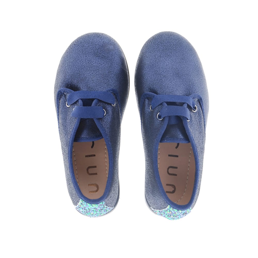 Este zapato de niña tiene un acabado brillante gracias a la piel metalizada en color azul o cubierto de glitter, que le combinarán con todo, ya sean prendas lisas o estampadas.