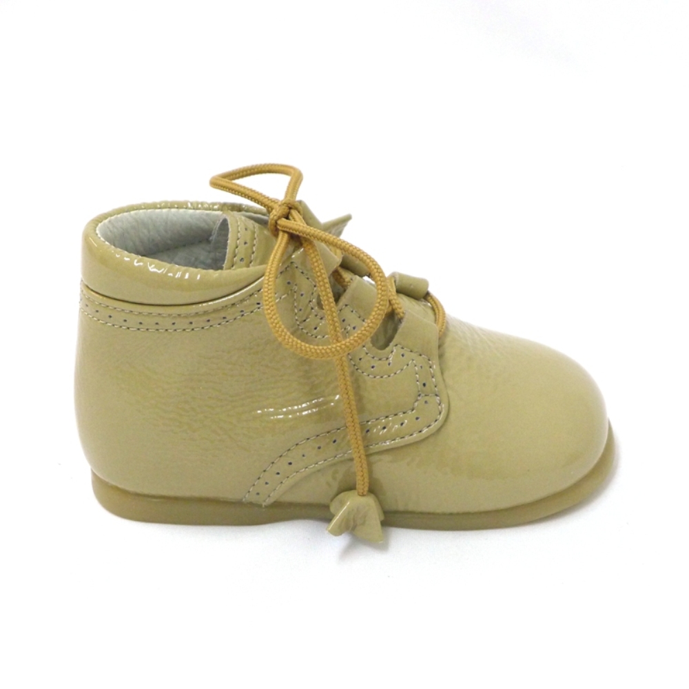 Botita unisex para bebé niña o bebé niño disponible en tres colores muy versátiles: piel charol blanco roto, pie charol taupe o piel charol beige.