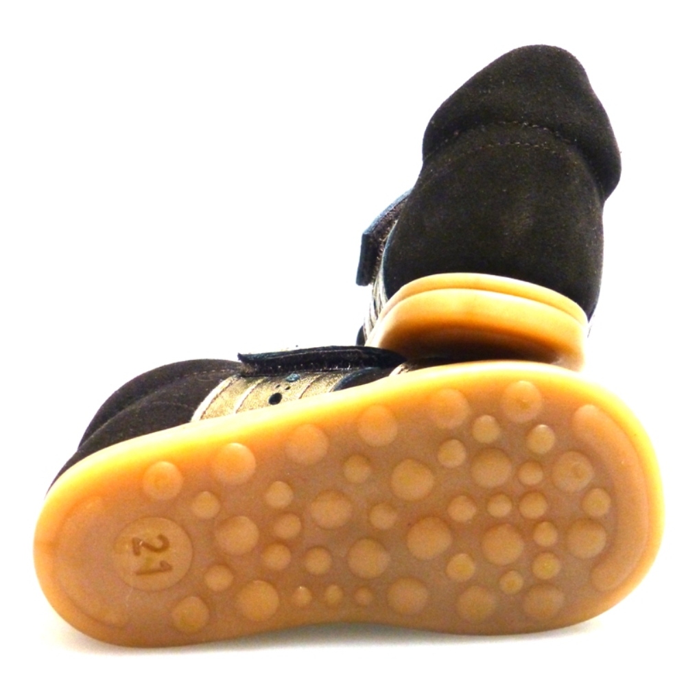 Piel nobuck marrón con tira del cierre en napa metalizada bronce. Consejos de talla: Calzan el número. Una bota sport muy práctica para la guardería por su comodidad y sobre todo por lo prácticas que son por el cierre.