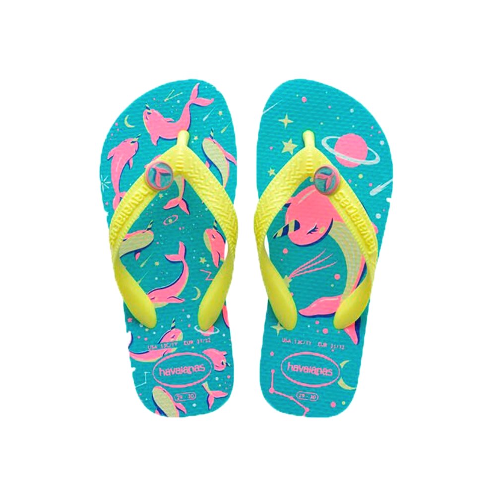 Disponible en diferentes colores, caucho natural turquesa y azul estampado de unicornios y celeste con delfines. Consejos de talla: La numeración es doble, por lo que la talla corresponde a esa talla y a la siguiente. Havaianas, nombre original de Hawai, creadas en Brasil en 1962, Se han convertido en las chanclas de caucho más chic del mundo, gracias a su comodidad y ligereza.