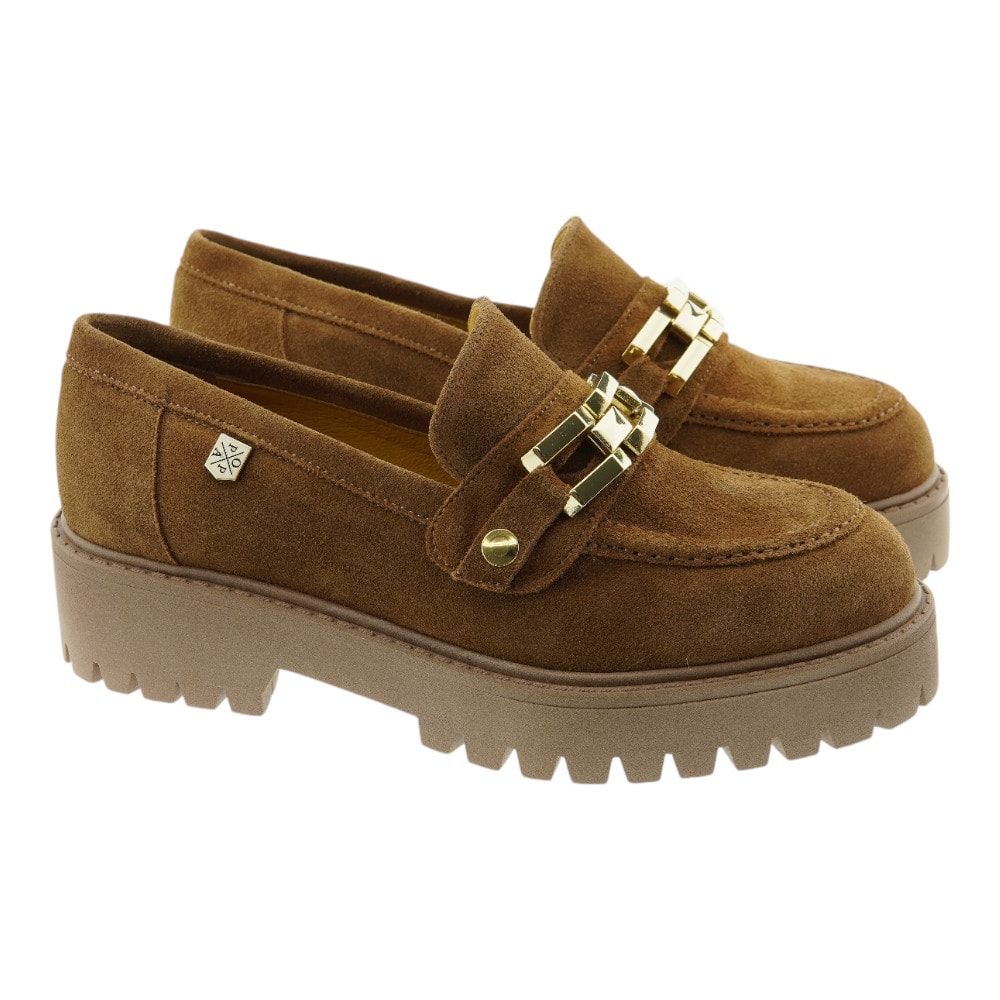 Mocasines de serraje Popa con suela gruesa de estilo track, perfectos para un look casual y sofisticado. Elegantes, cómodos y con detalles metálicos.