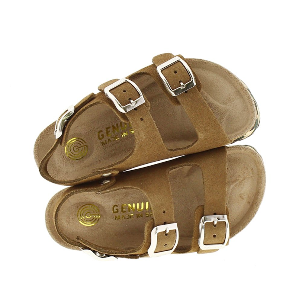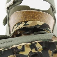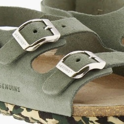 Sandalia bio de estilo renovado, en piel de ante con suela de goma antideslizante de estampado militan. Unas sandalias originas y prácticas para combinar con todos sus conjuntos veraniegos.