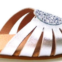 En piel metalizada plateada con un adorno en forma de circulo con brilli-brilli plateado en la pala. Combinable con pantalones cortitos y vestidos o faldas veraniegas.
