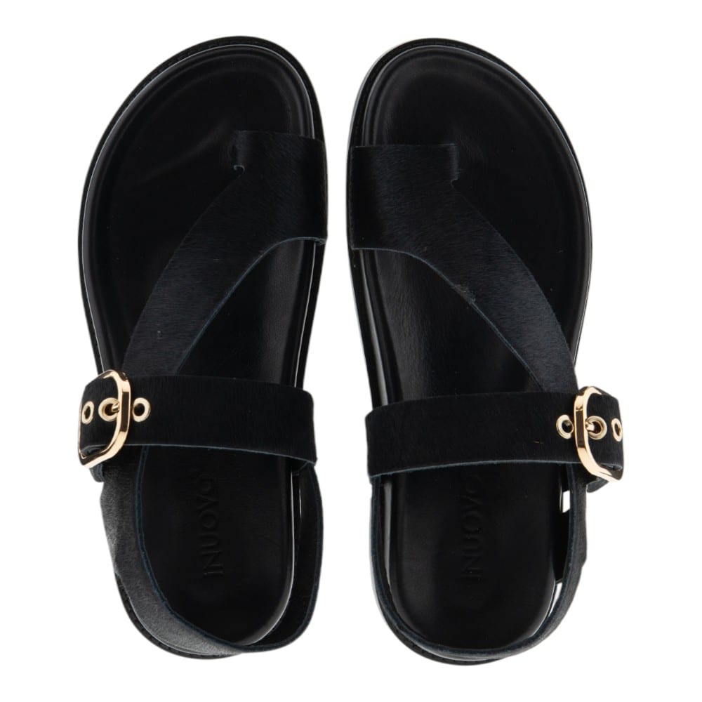 Fabricadas en piel negra con textura y acabadas con una elegante hebilla dorada, las Sandalias Dedo Mujer Inuovo fusionan estilo y confort. Su diseño minimalista y ergonómico se adapta al pie, aportando estabilidad y sofisticación a tus outfits.