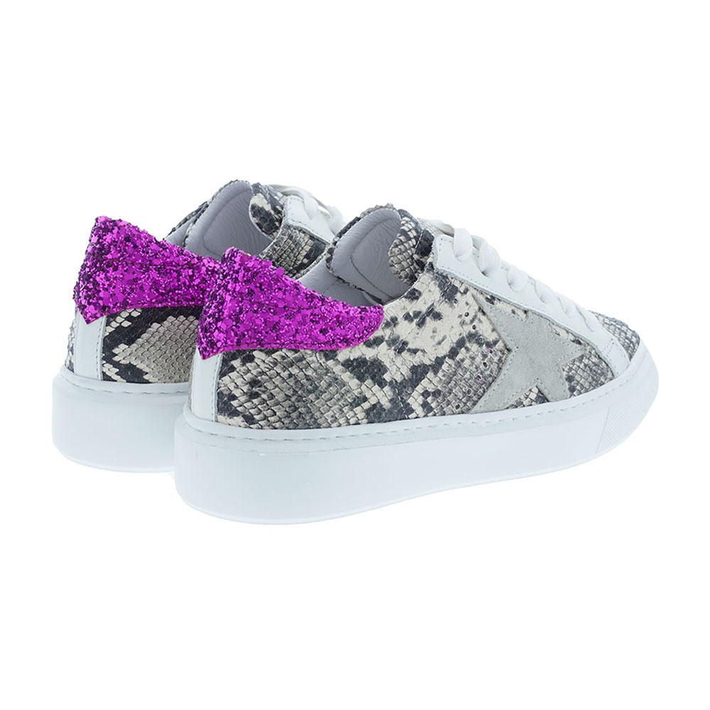 Zapatilla en piel blanca de napa con talón y lengüeta en gris metalizada y una tira en rosa llamativo- Cierres con cordón de cinta para dar un toque más arreglado a tus look de sport.