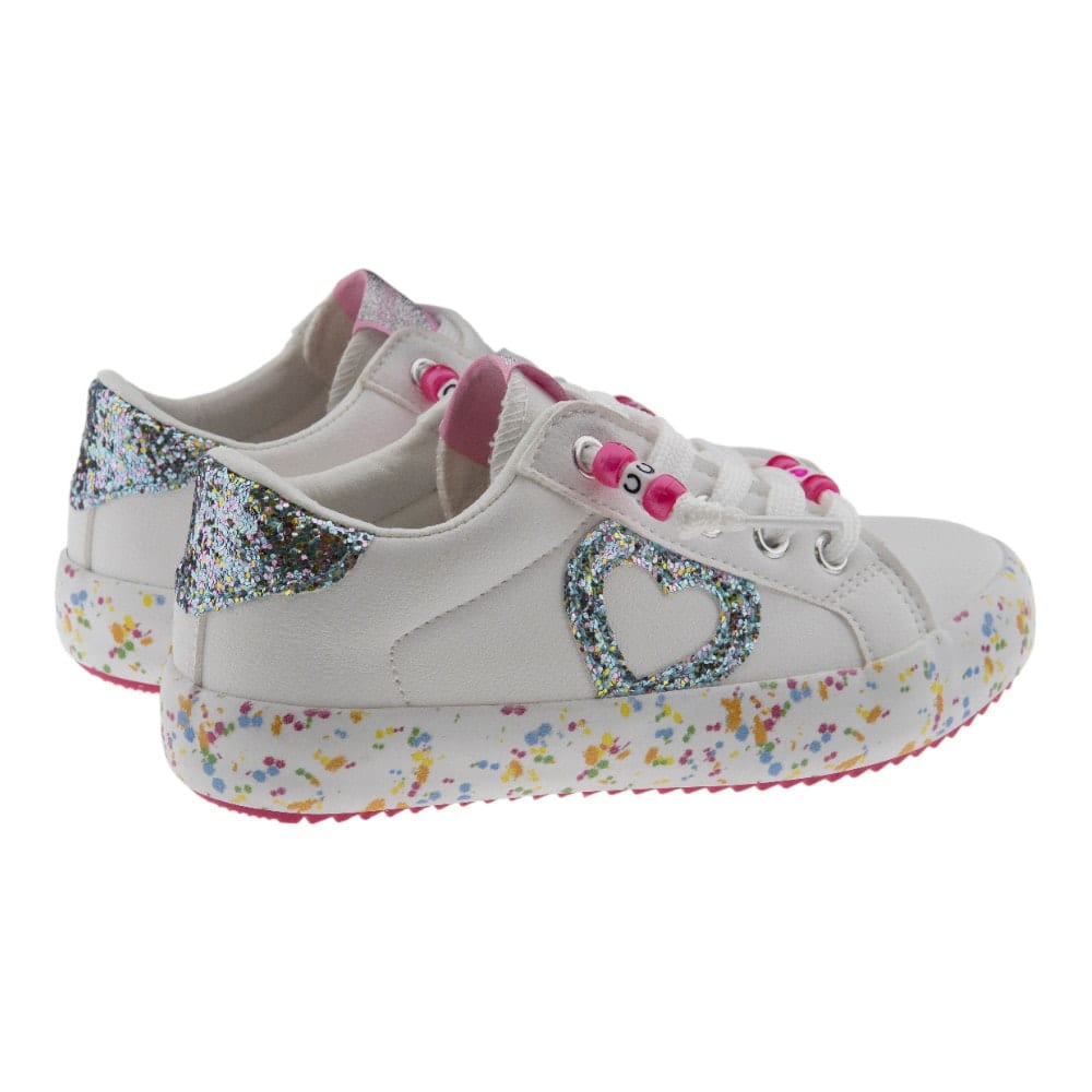 Zapatillas Conguitos para niña, destacando con un corazón brillante y una suela estampada multicolor, perfectas para un look moderno y divertido.