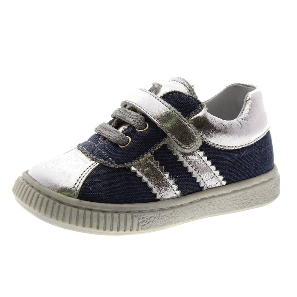 Disponibles en diferentes colores, piel metalizada oro con glitter multicolor y piel metalizada plata con tejido jeans. Consejos de talla: Calzan el número. Este zapato mezcla la estética deportiva de una zapatilla con la horma de un zapato. Este estilo de calzado es el más idóneo para calzar los pies de tu hija a diario para ir a la guardería o al colegio, combinadas con ropa de sport. El detalle de la brillantina le pone el toque estiloso para que el zapato no sea tan informal.