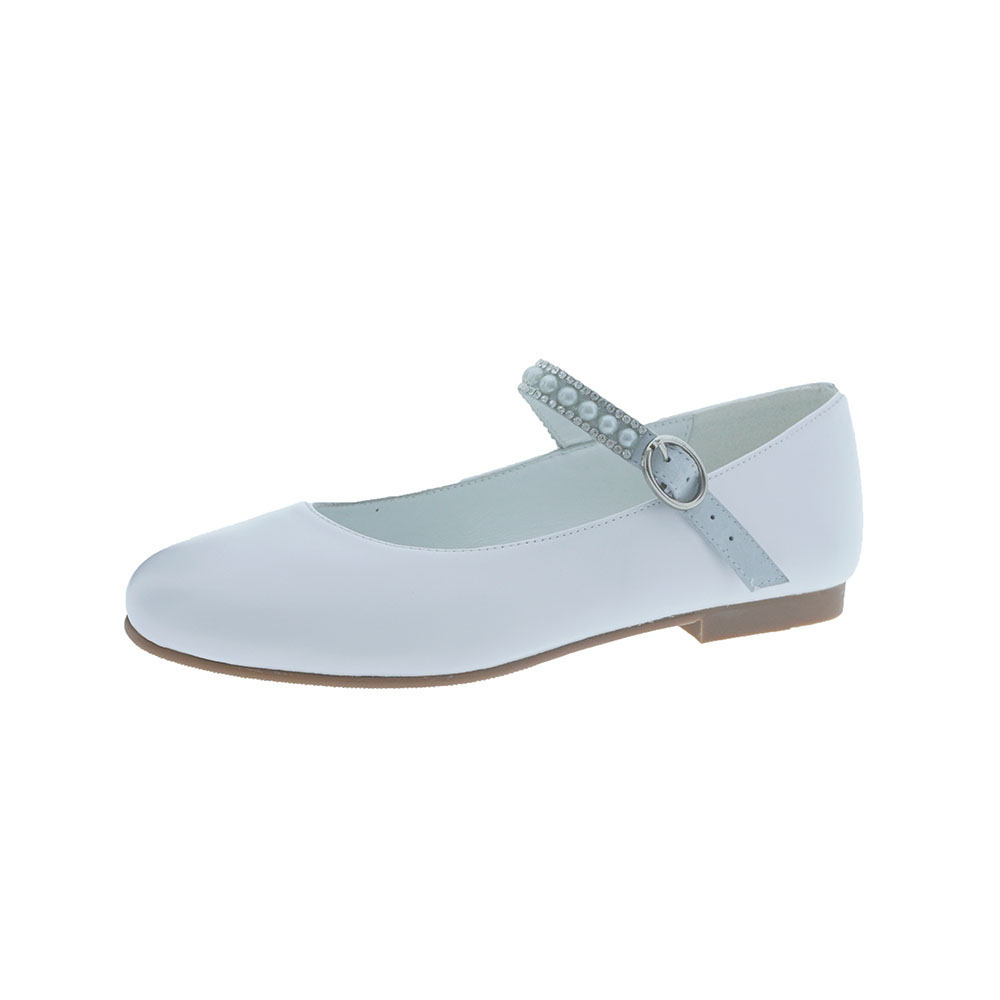 Disponible en diferentes colores, piel color beig y piel color blanco. Consejos de talla: Calzan el número. El diseño de este zapato de comuniòn es clásico, pero muy especial gracias al detalle de las perlas y los brillantes. Este zapato lo combinaremos con vestido sde corte clásico en color blanco. Para ir a juego del zapato, en el pelo las niñas podrán levar algún adorno con perlas.